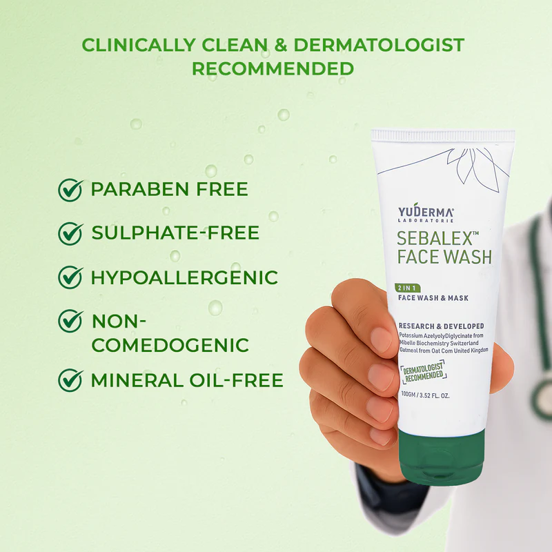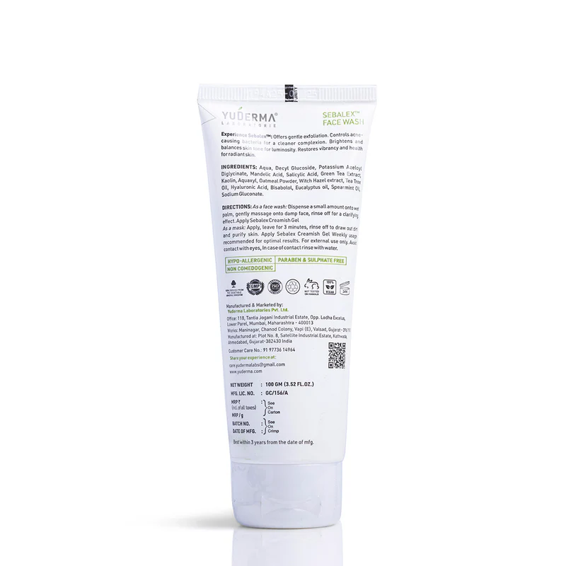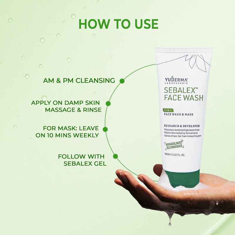 Yuderma Sebalex 2 in 1 Face Wash is a dual-action cleanser designed for oily and combination skin. With Potassium Azeloyl Diglycinate, Mandelic Acid, and Salicylic Acid, it targets mild to moderate acne, helps clear blackheads and whiteheads, and supports a brighter, more even complexion. Its gentle formula removes impurities while maintaining the skin’s natural pH balance